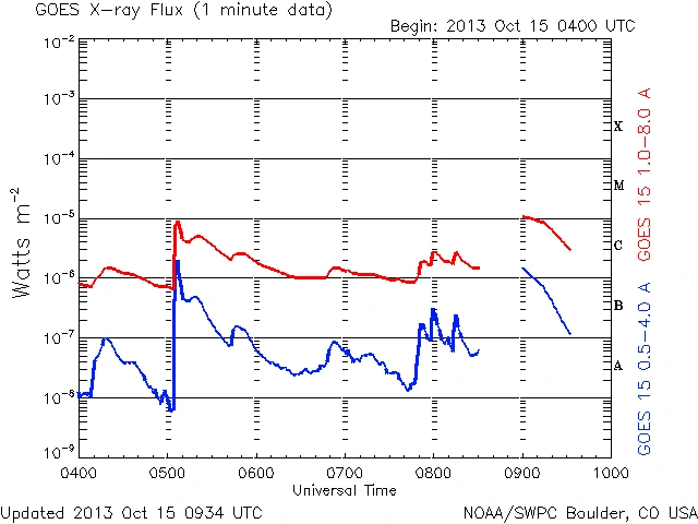 ■強度不明のフレア■ 2013.10.15 10/15 17:35頃、チャートで値が取れてませんが、少し大きめなフレアがあったようです。 ■17:35頃の衛星画像 ■同時刻のX腺チャート データが欠落してますが、そこそこの大きさがあったと思われます。 詳細が分かれば続報あげます。 by dorachi