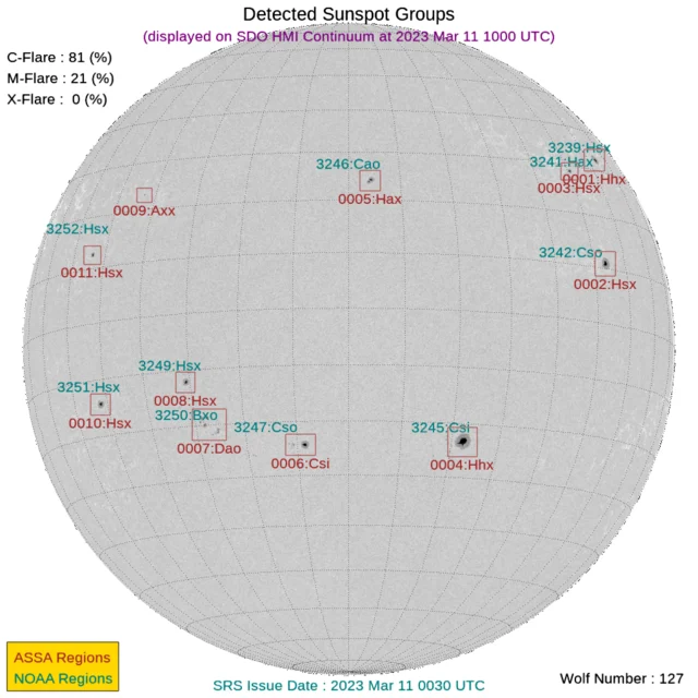 現時点で地球正面の黒点群は3245,3246,3247です。←黒点番号が振られていない活動領域でもフレアは発生しますので、あくまで目安として捉えてください。