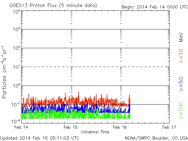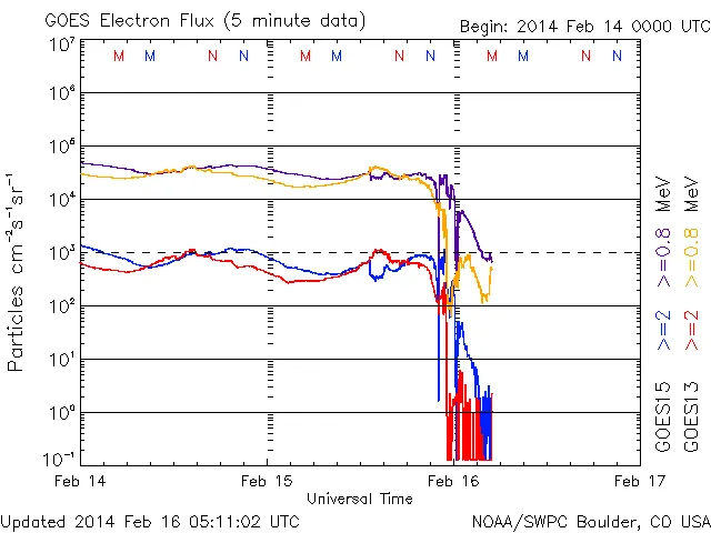 穏やかに推移していましたが、02/15 21時(UT)くらいから激しい落ち込みがあり、現在>=2MeVのラインは下限で激しい乱れがあります。