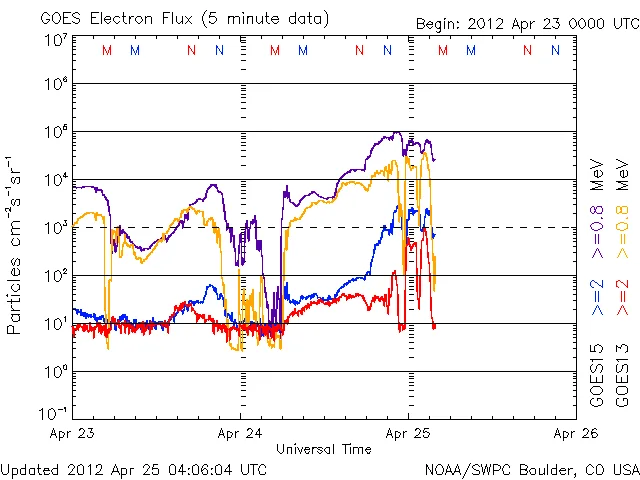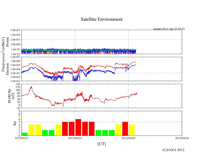 ※JAXAのETS8 MAMリアルタイム観測データのチャートは1目盛り=6時間なので、かなり見づらいです。時間の誤差に注意