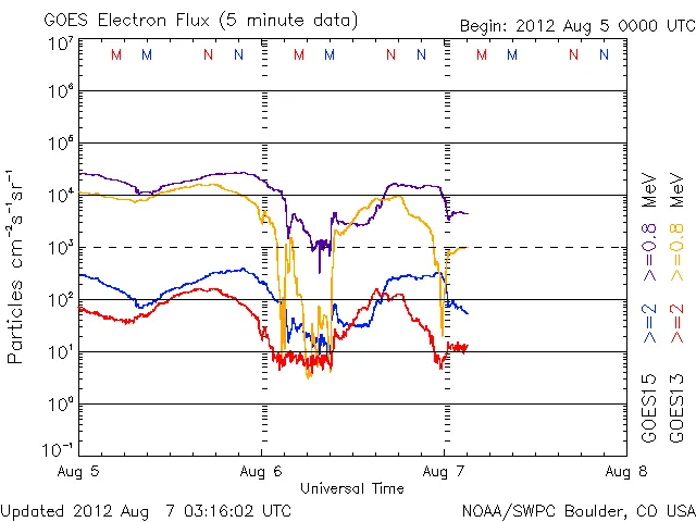 ※JAXAのETS8 MAMリアルタイム観測データのチャートは1目盛り=6時間なので、かなり見づらいです。時間の誤差に注意