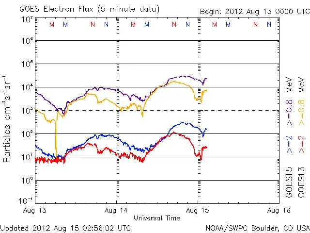 ●8月18日(特異日)太陽フレアの発生と地球上空の静止軌道電子の動きを月末まで監視しましょう。