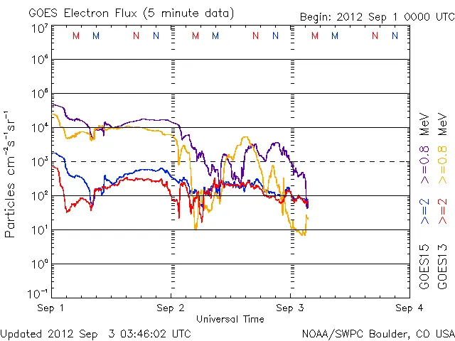 ※JAXAのETS8 MAMリアルタイム観測データのチャートは1目盛り=6時間なので、かなり見づらいです。時間の誤差に注意
