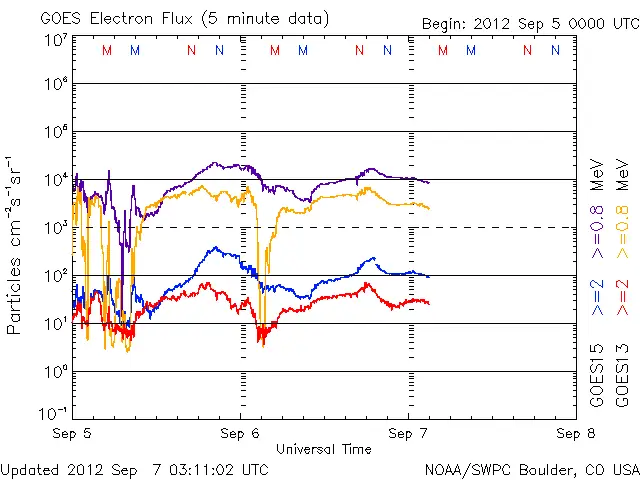 ※JAXAのETS8 MAMリアルタイム観測データのチャートは1目盛り=6時間なので、かなり見づらいです。時間の誤差に注意