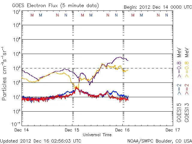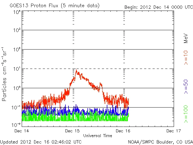 12/14 09時(UT)頃から上昇し始めたプロトンは12/15 02時(UT)がピークで、以降は下がり続けています。