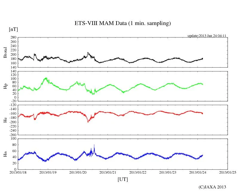 ※JAXAのETS8 MAMリアルタイム観測データのチャートは1目盛り=6時間なので、かなり見づらいです。時間の誤差に注意