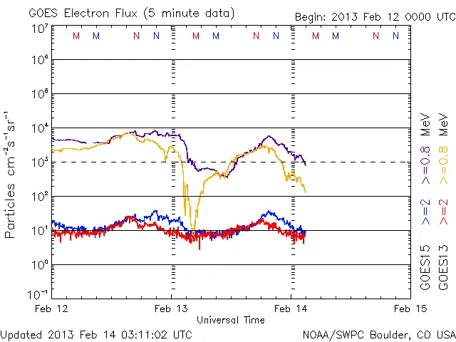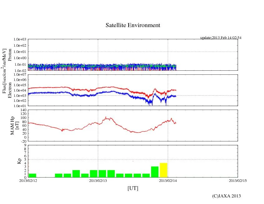 02/13 02時~04時(UT)頃、>=0.8MeVのラインに急激な落ち込みがあり、その後、23時(UT)と02/14 03時(UT)くらいに反応が出ています。