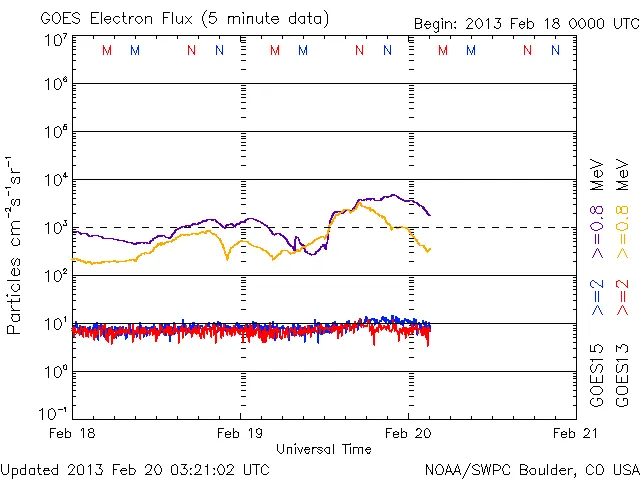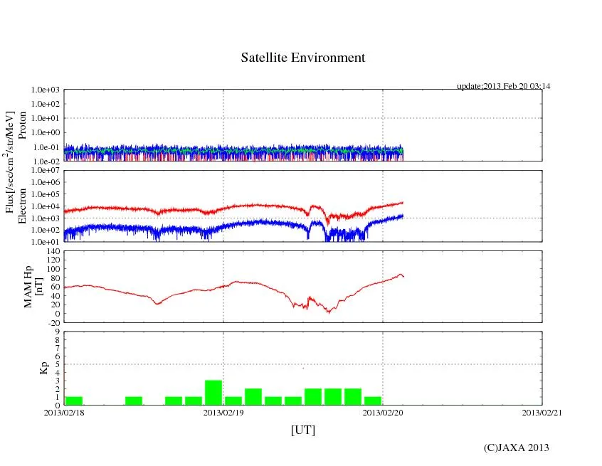 02/19 07時(UT)くらいに>=0.8MeVのラインに上向きな反応が少し出ていますが、極端な反応や乱れは出ていません。