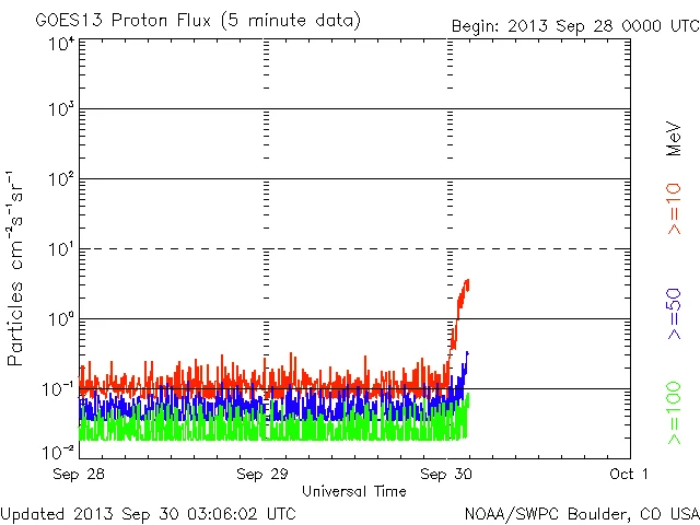 今朝6時頃発生したフレアの影響か、Protonが上昇しています。今のところCME到着予測はありませんが、CME到着となるとGOESのチャートにも乱れが出るかもしれません。