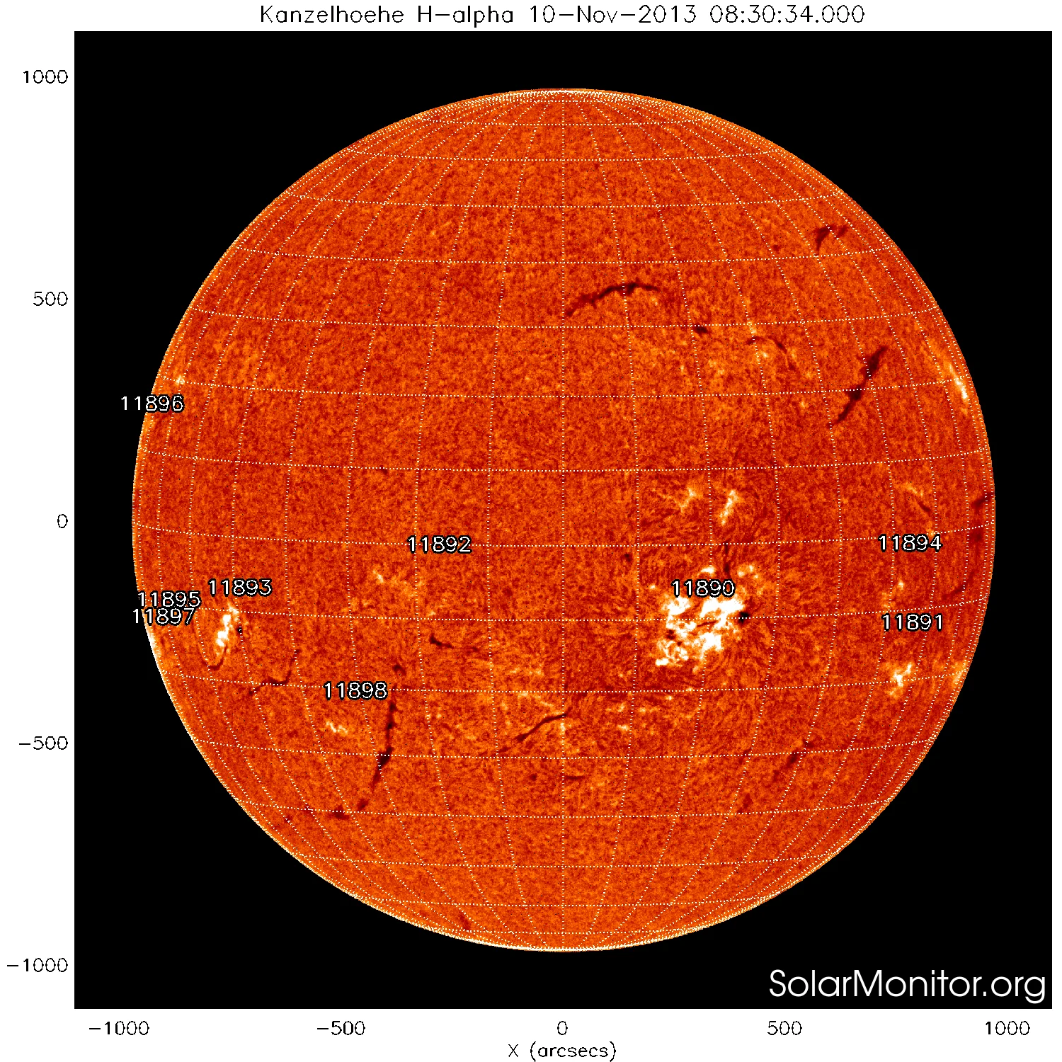 1890の磁場タイプはβγδ型のままです。大きく複雑な黒点群。要警戒(南半球西側)