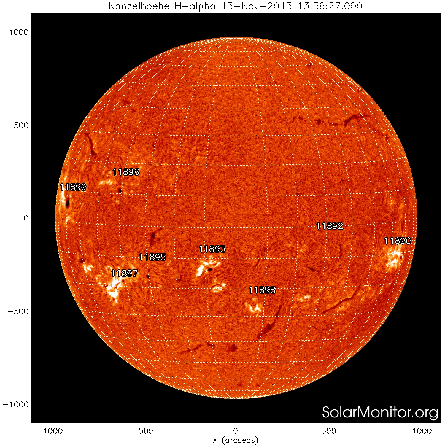 現時点で地球の正面あたりにある黒点群は1893、1898です。←黒点番号が振られていない活動領域でもフレアは発生しますので、あくまで目安として捉えてください。