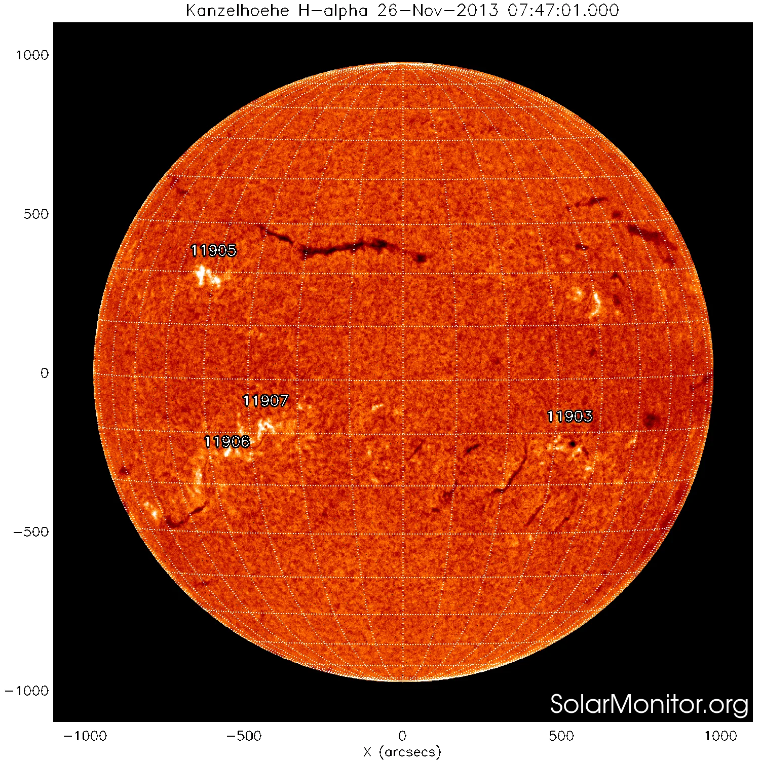 現時点で地球の正面あたりにある黒点群は1907です。←黒点番号が振られていない活動領域でもフレアは発生しますので、あくまで目安として捉えてください。