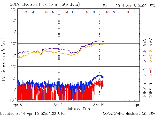>=2.0MeVのラインは03/31 18時(UT)以降乱れが続いています。04/09 21時(UT)以降は断続的な乱れになってきています。
