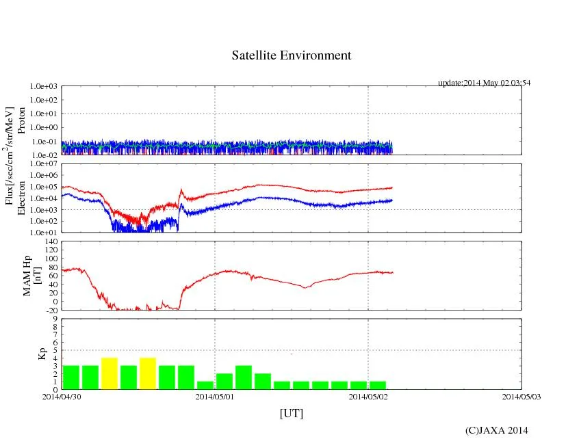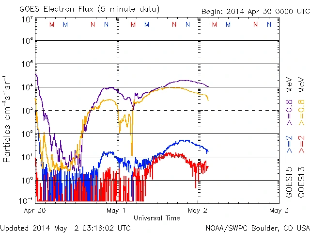 >=2MeVのラインは05/01 10時(UT)くらいまで乱れがありました。その後、05/01 22時(UT)くらいから、やや乱れが出ています。