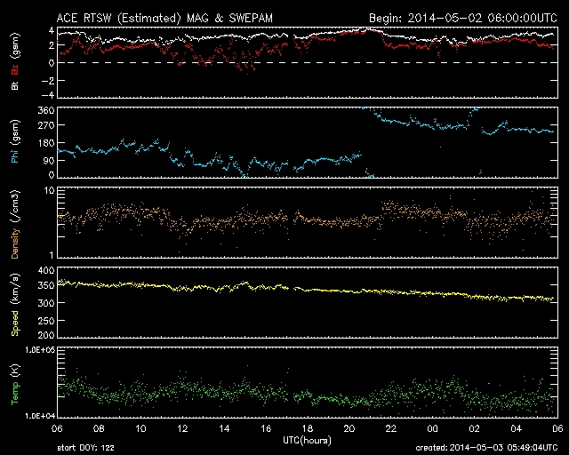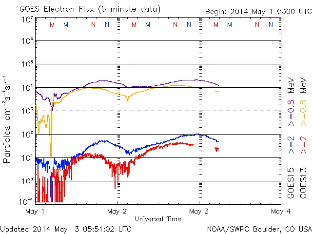 >=2MeVのラインは、05/01 22時(UT)くらいから05/02 05時(UT)くらいにかけて少し乱れがありました。