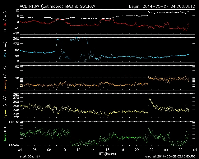 360km/s前後から330km/s前後まで落ち込んだ後、05/07 21時(UT)頃、370km/sまで急上昇しました。