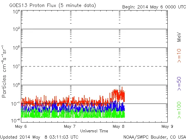太陽フレアと黒点数(2014年05月08日更新) ※中規模発生。チャートに乱れあり