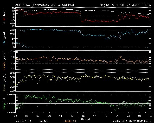 磁場は、北にずっと振れていましたが、05/23 14時(UT)くらいに南に切り替わりました。現在は南北に振れるようになってきています。