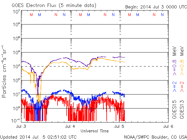 >=0.8MeVのラインは07/04 09時(UT)くらいにレベルが少し上がりましたが、今のところは大きな乱れは有りません。