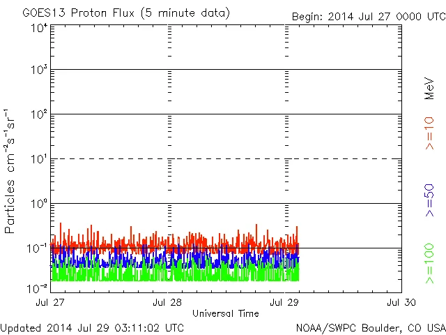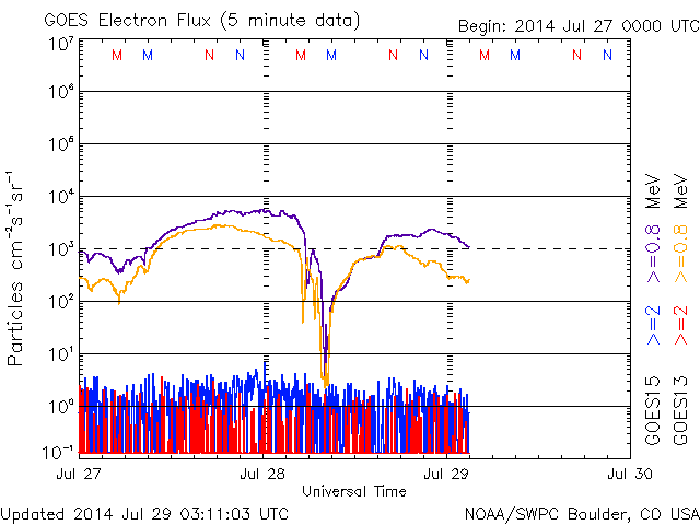 >=0.8MeVのラインは07/28 04時(UT)くらいから09時(UT)くらいにかけて強い反応が出ています。12時半の時点で、やや乱れの傾向があります。