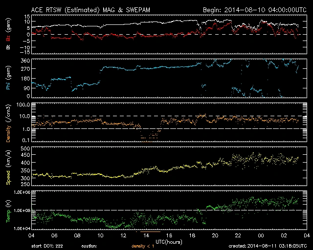 320km/sで推移していましたが、日付が変わる頃から少しずつ上がり、現在は400~450km/sくらいで速度にややバラつきがあります。