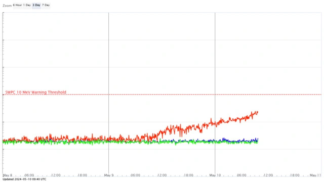 Xクラスはすべて3664が発生源。Mクラスは3663や南半球西側の活動領域でも発生しています。proton、上昇中。