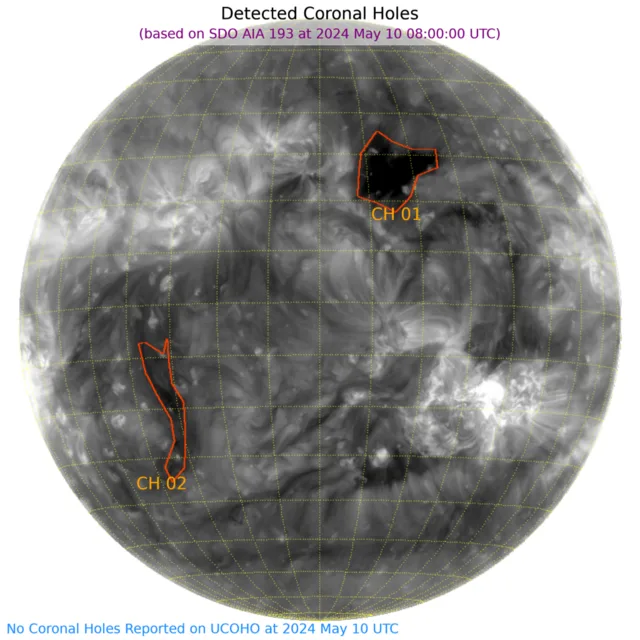 北半球西より、南半球東側にコロナホールがあります
