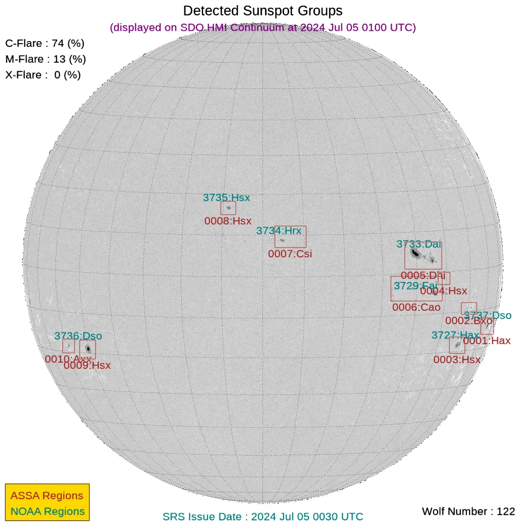 現時点で地球正面の黒点群は[3734, 3735]です。←黒点番号が振られていない活動領域でもフレアは発生しますので、あくまで目安として捉えてください。