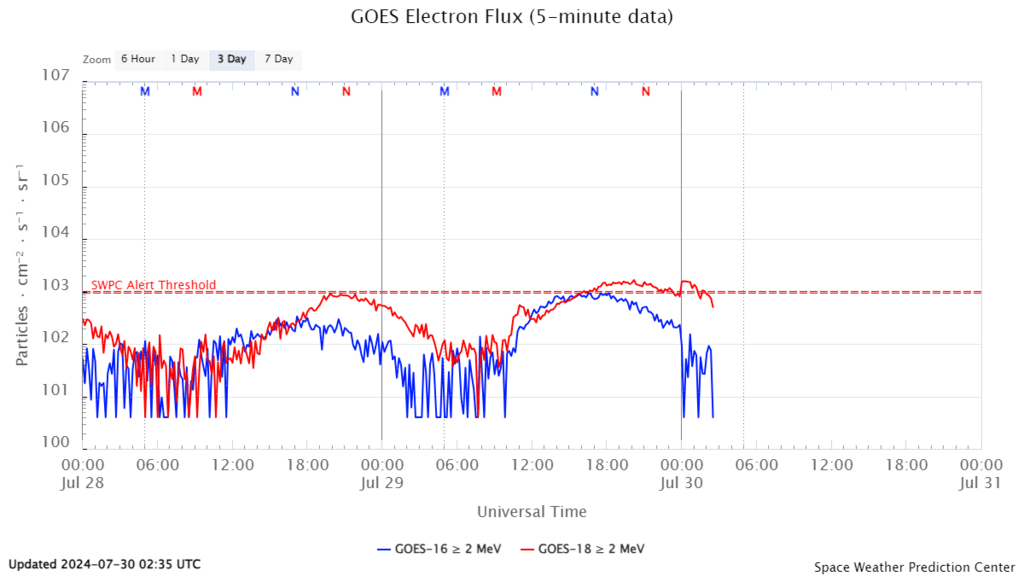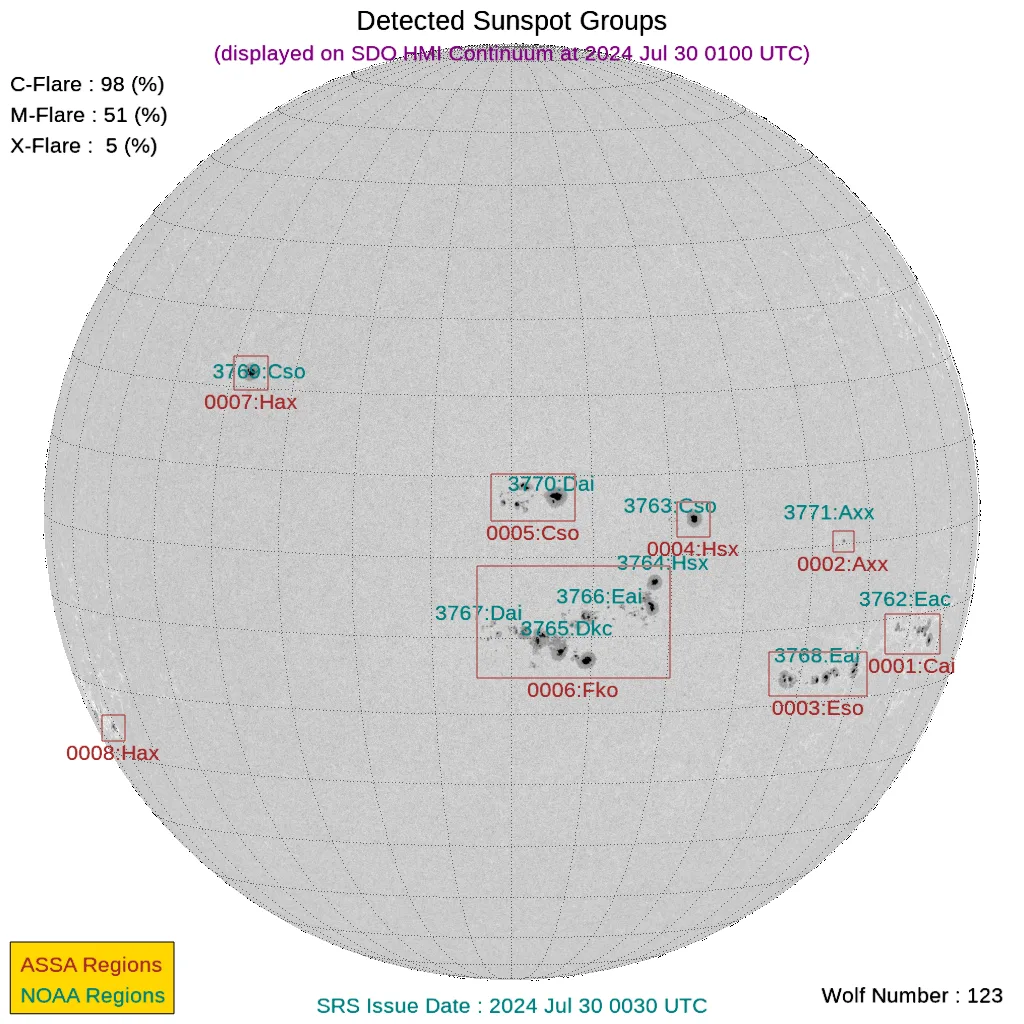 太陽フレアと黒点数(2024年07月30日更新)※中規模多発&CME到着予測あり