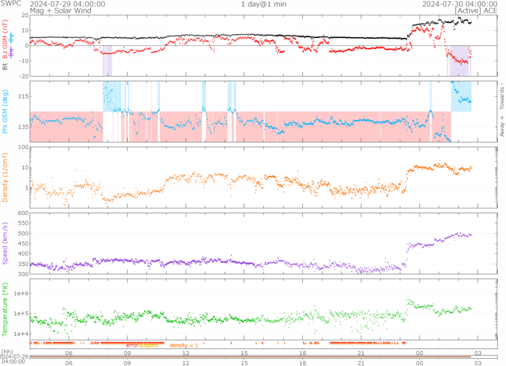 350km/s前後で推移していましたが、08時頃から一段が上がり、現在480km/s前後で推移しています