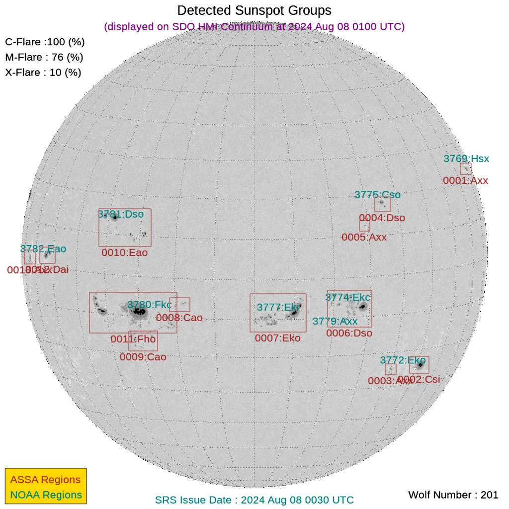 太陽フレアと黒点数(2024年08月08日更新)※中規模数回&CME到着予測あり