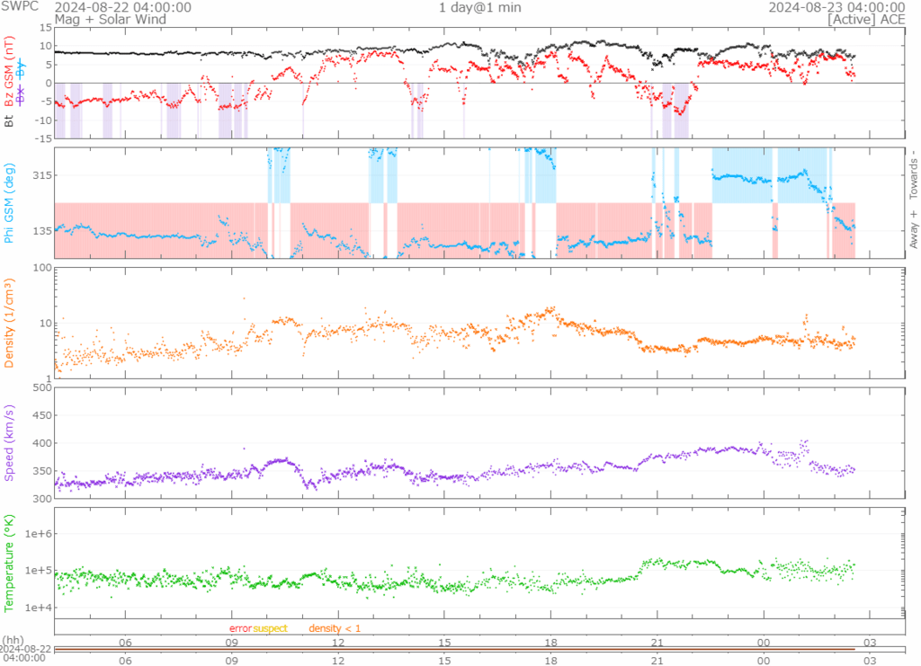 330km/s前後で推移していましたが徐々に上がり一時380km/s前後で推移しました。現在は少し下がって350km/s前後で推移しています