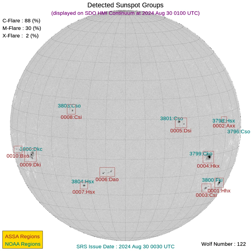 現時点で地球正面の黒点群は[3801, 3804]です。←黒点番号が振られていない活動領域でもフレアは発生しますので、あくまで目安として捉えてください。