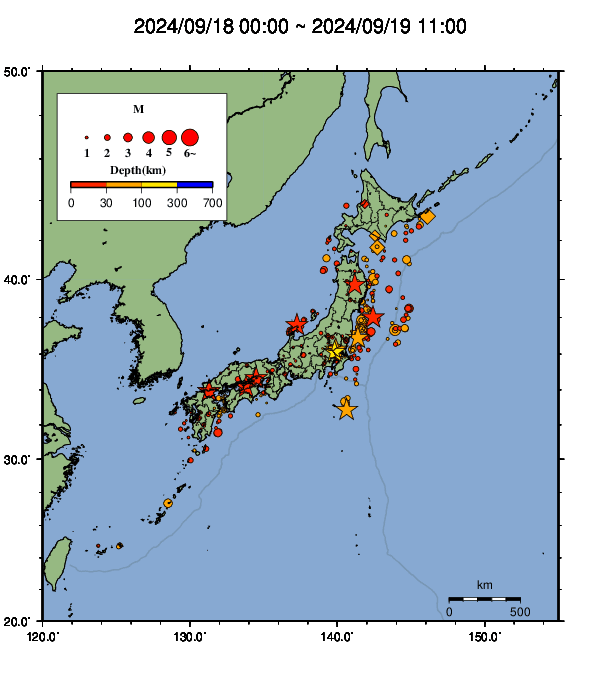 ●Hi-net日本地震分布と気象庁・・・hi-netの小笠原のデータは掲載日がずれて反映されるようです(翌々日に掲載)。掲載されないものもあるようなので気象庁の画像も付けます
