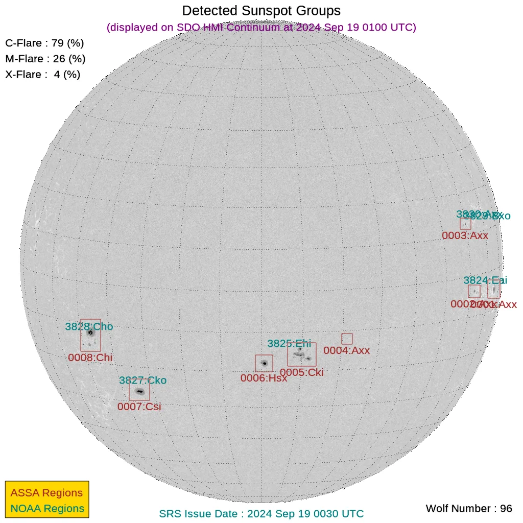 現時点で地球正面の黒点群は[3825]です。←黒点番号が振られていない活動領域でもフレアは発生しますので、あくまで目安として捉えてください。