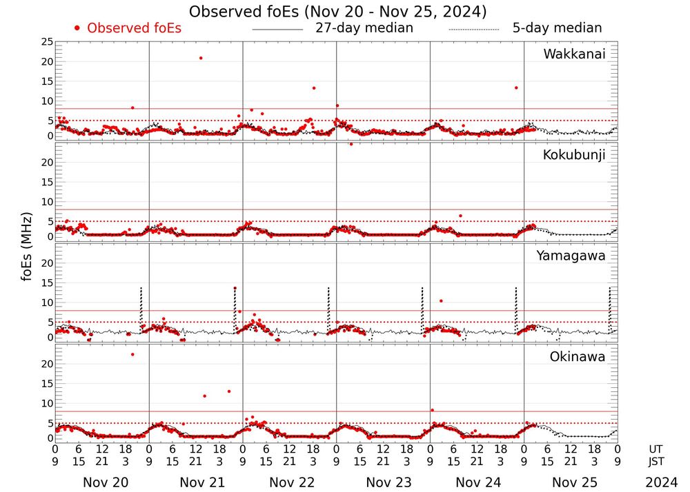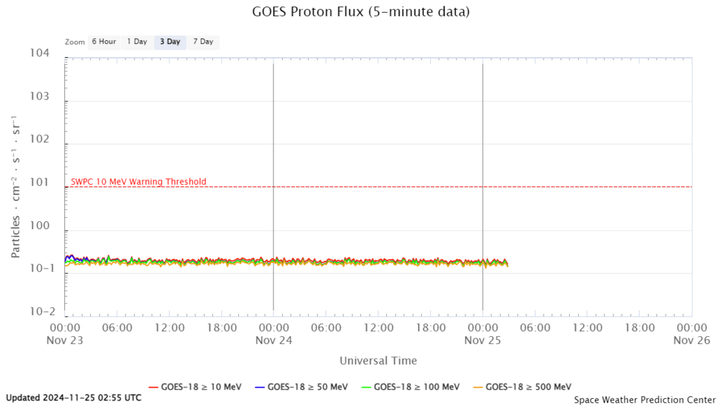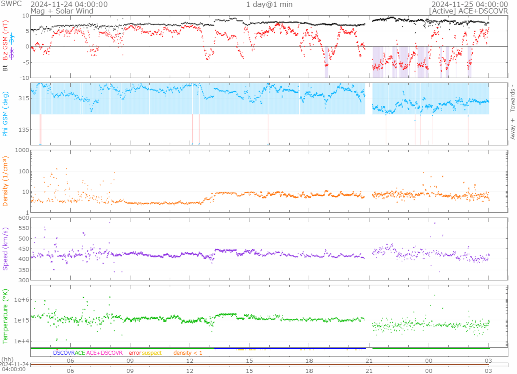 引き続き400km/s前後で推移していますが、時折500km/s前後の突風のような太陽風も吹いています。