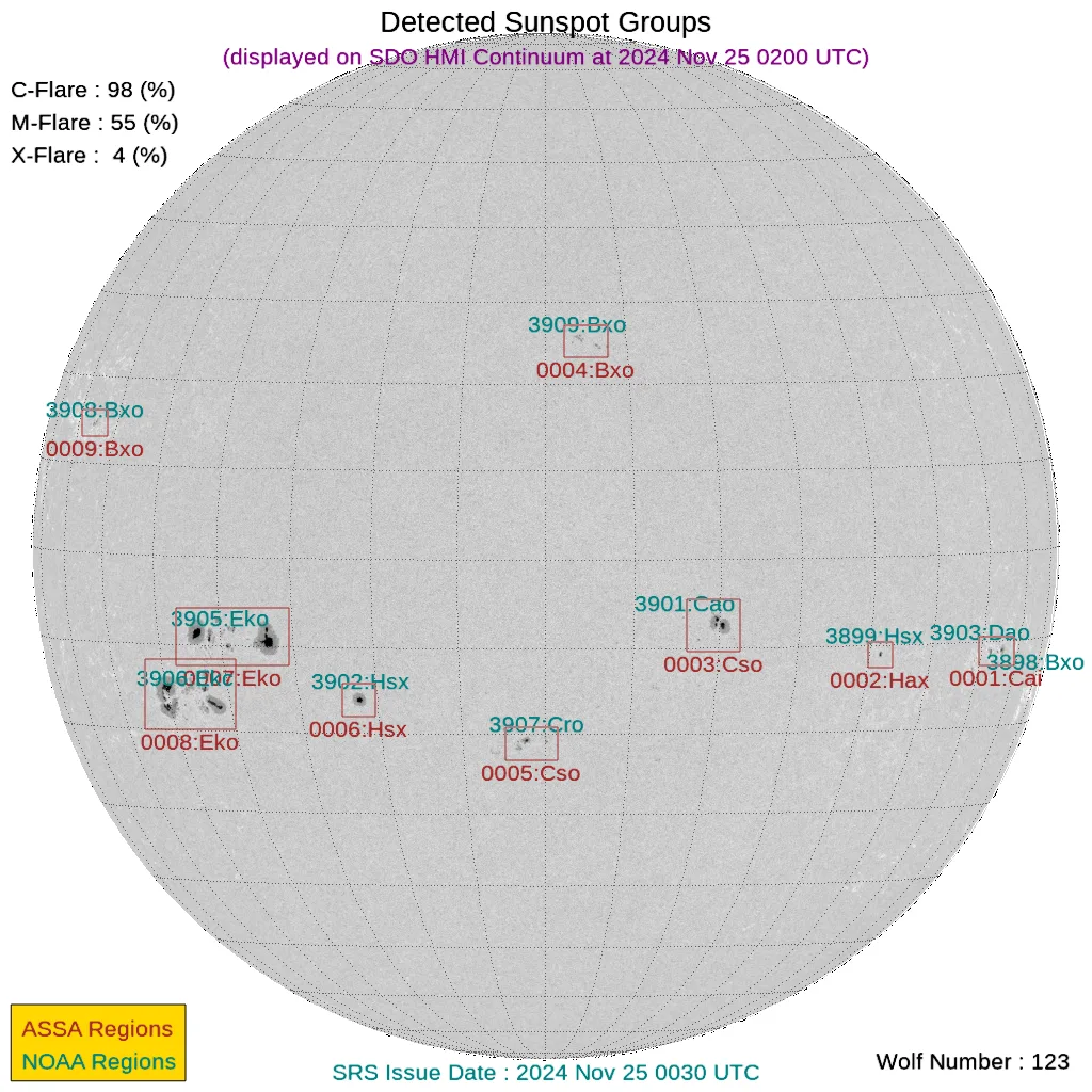 現時点で地球正面の黒点群は[3901, 3902, 3907, 3909]です。←黒点番号が振られていない活動領域でもフレアは発生しますので、あくまで目安として捉えてください。