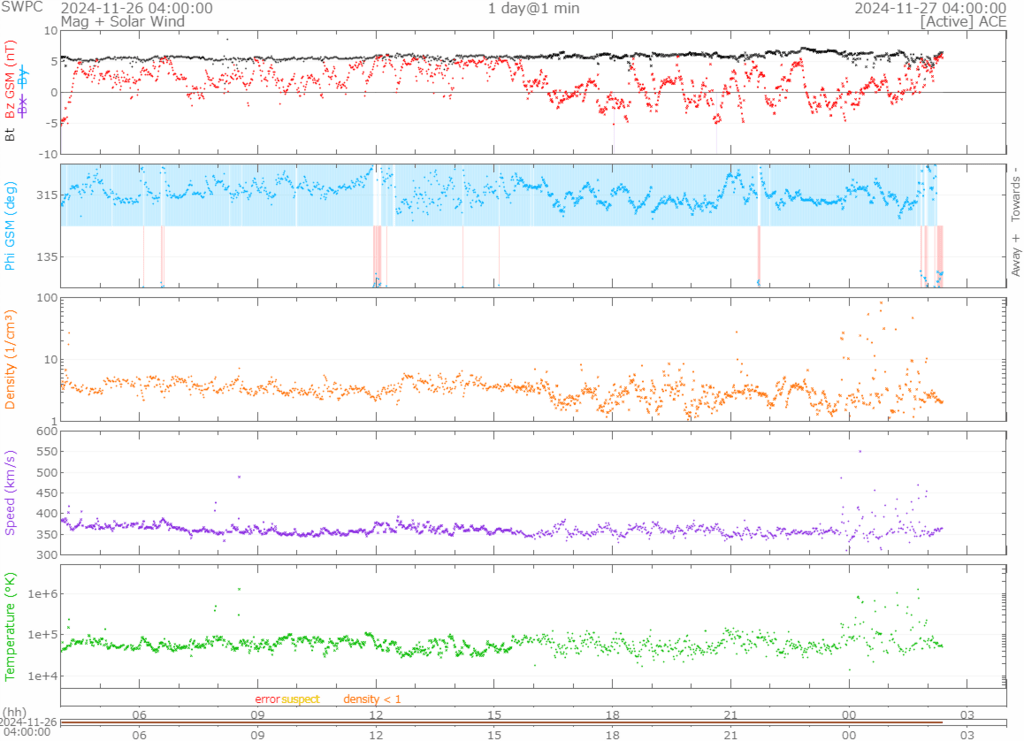 速度は少し下がって370km/s前後で推移していますが、時折500km/s前後の突風も吹いているようです。