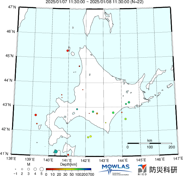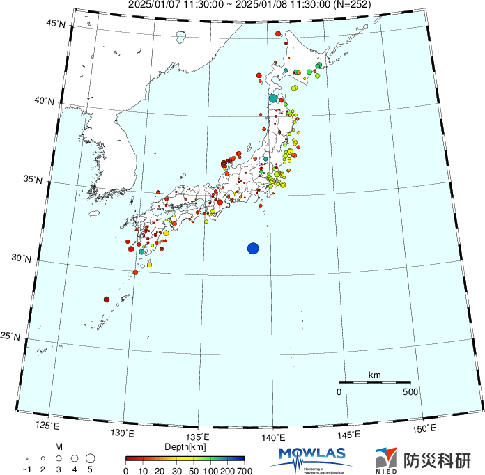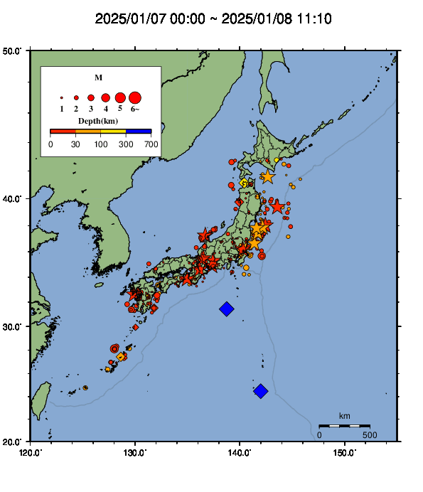 ●Hi-net日本地震分布と気象庁・・・hi-netの小笠原のデータは掲載日がずれて反映されるようです(翌々日に掲載)。掲載されないものもあるようなので気象庁の画像も付けます