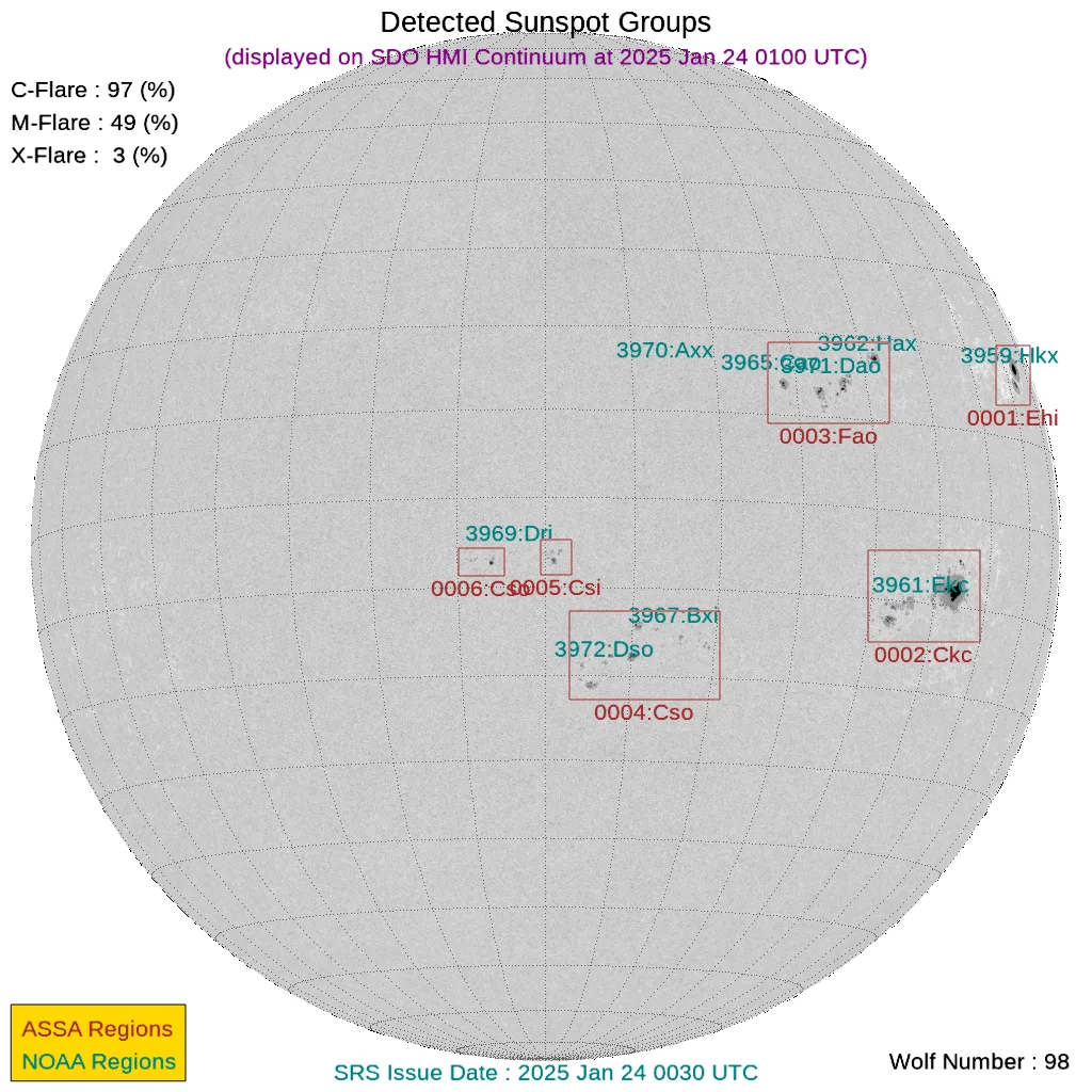 現時点で地球正面の黒点群は[3967, 3969, 3970, 3972]です。←黒点番号が振られていない活動領域でもフレアは発生しますので、あくまで目安として捉えてください。