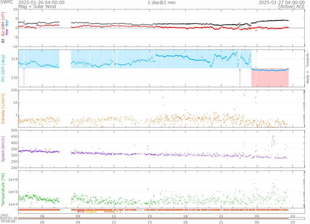 330km/s前後で推移していましがた下がり続け、現在280km/s前後で推移していますが、380~450km/s前後の速度にばらつきがある太陽風も吹いています