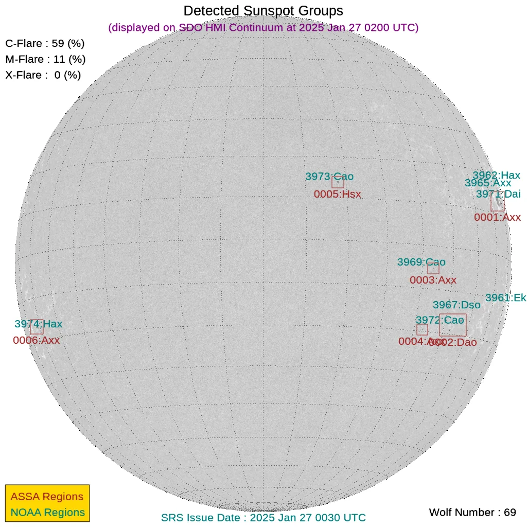 現時点で地球正面の黒点群は[3973]です。←黒点番号が振られていない活動領域でもフレアは発生しますので、あくまで目安として捉えてください。