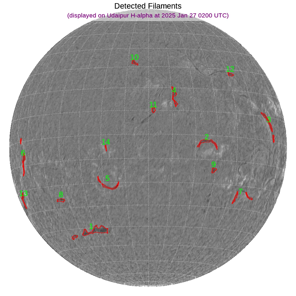 赤道付近西端と東寄り・西側と南半球東側に少し長めのフィラメントがあります。