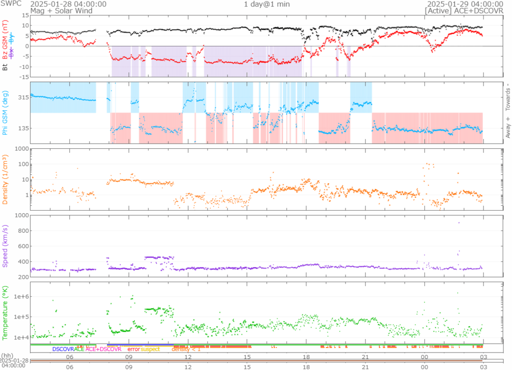 310km/s前後で推移していますが、時折500km/s前後の突風も吹いているようです。