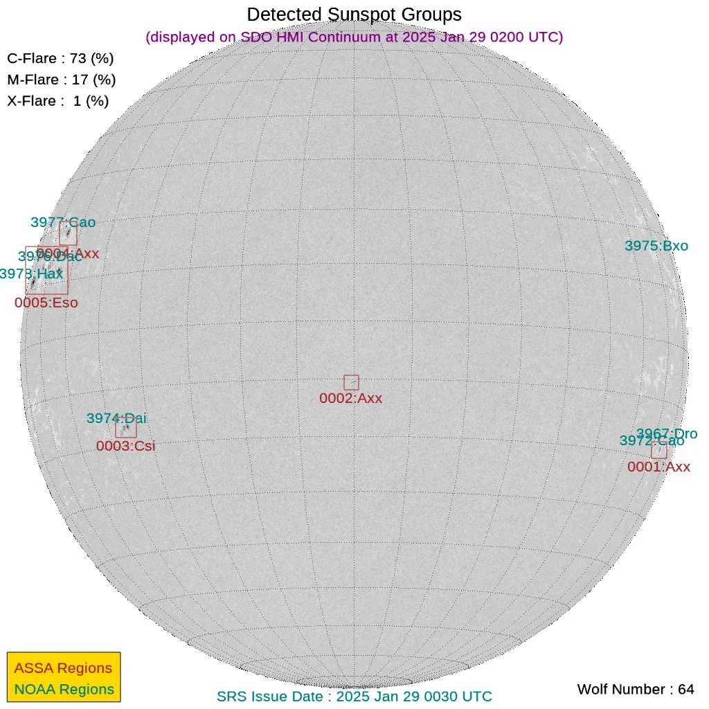 現時点で地球正面の黒点群はありません。←黒点番号が振られていない活動領域でもフレアは発生しますので、あくまで目安として捉えてください。