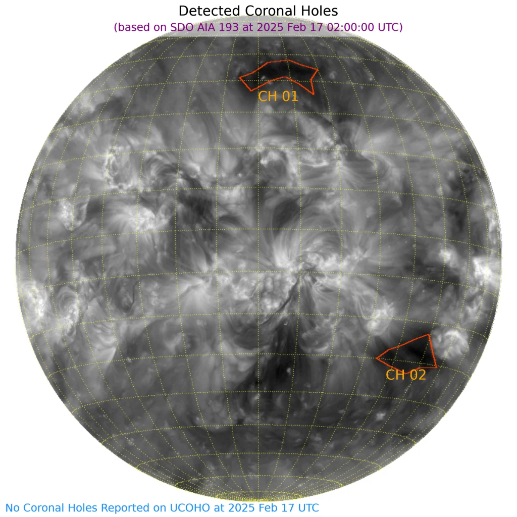 北半球(高緯度)中心付近と南半球西端にコロナホールがあります