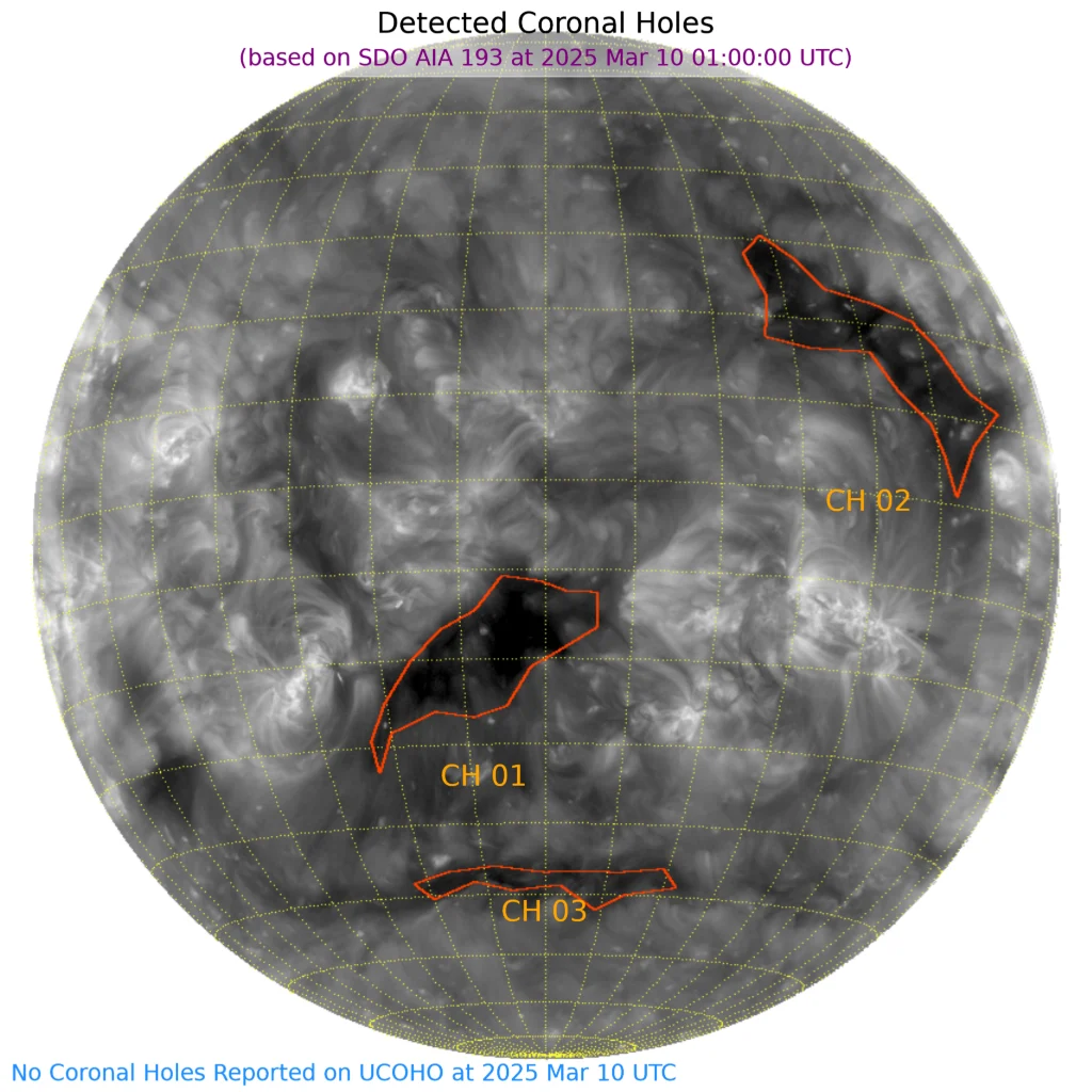 北半球西側と南半球中心付近×2個、コロナホールがあります。