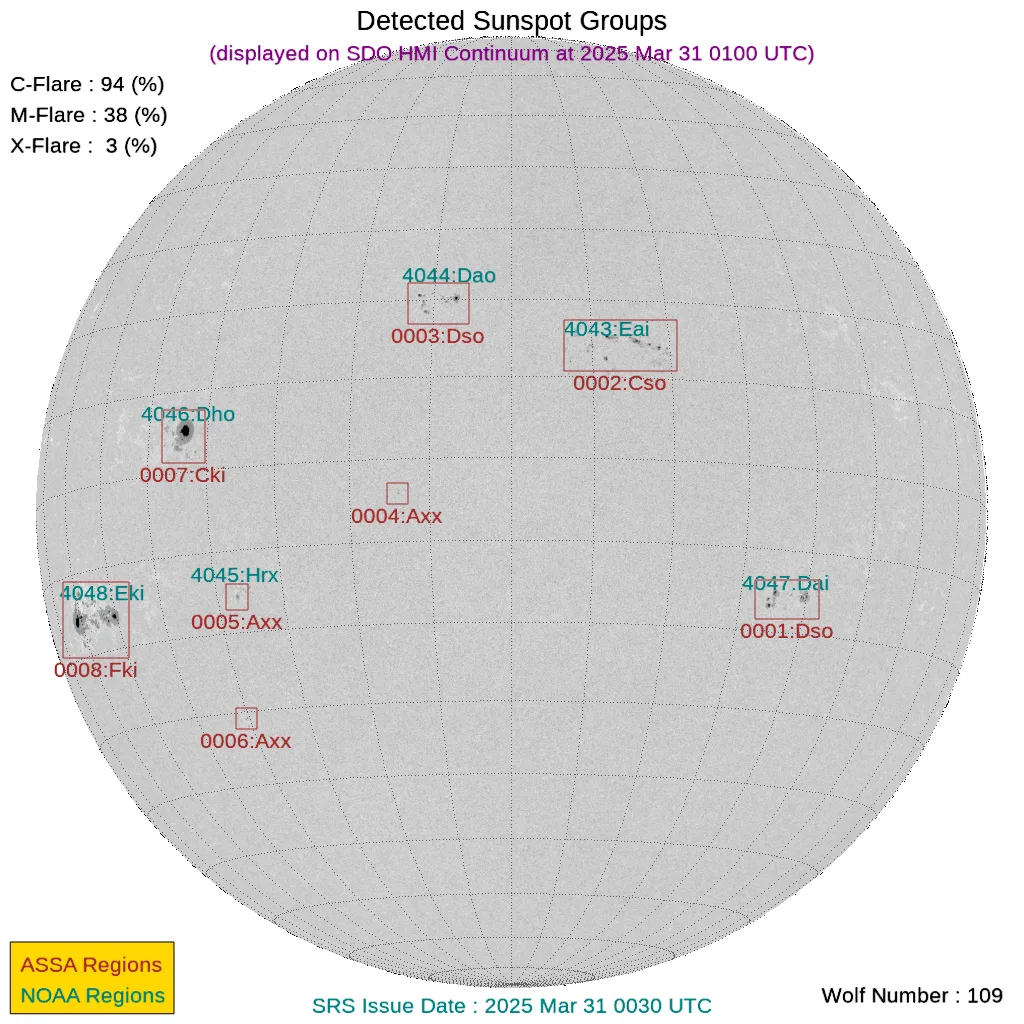 現時点で地球正面の黒点群は[4043, 4044]です。←黒点番号が振られていない活動領域でもフレアは発生しますので、あくまで目安として捉えてください。
