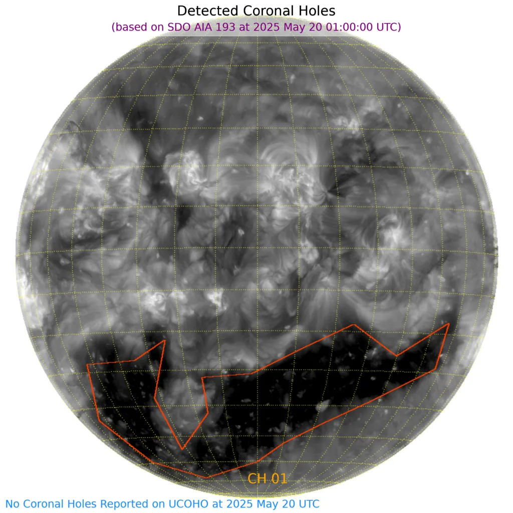 南半球(高緯度)東端から西端へ東西に広がる大きなコロナホールがあります