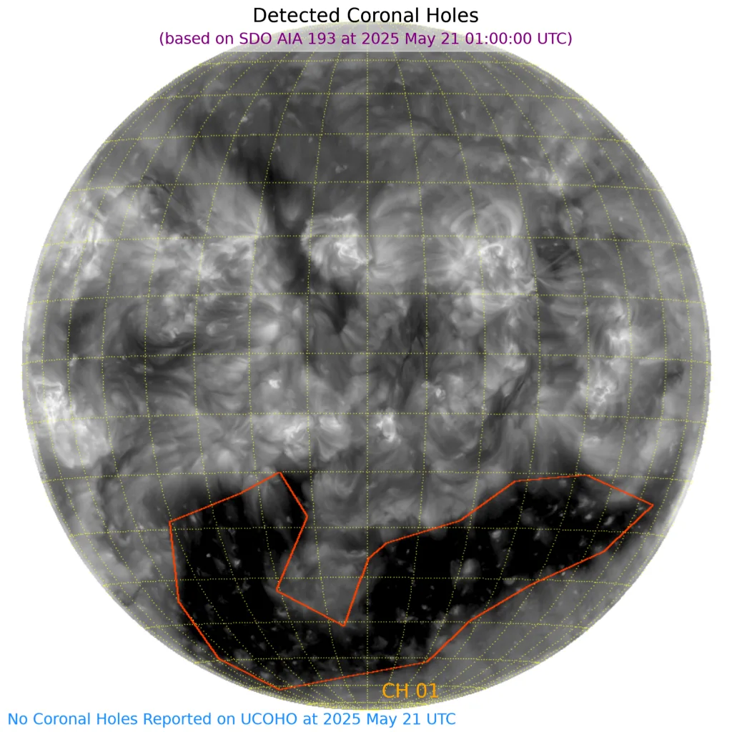 南半球(高緯度)東端から西端へ東西に広がる大きなコロナホールがあります